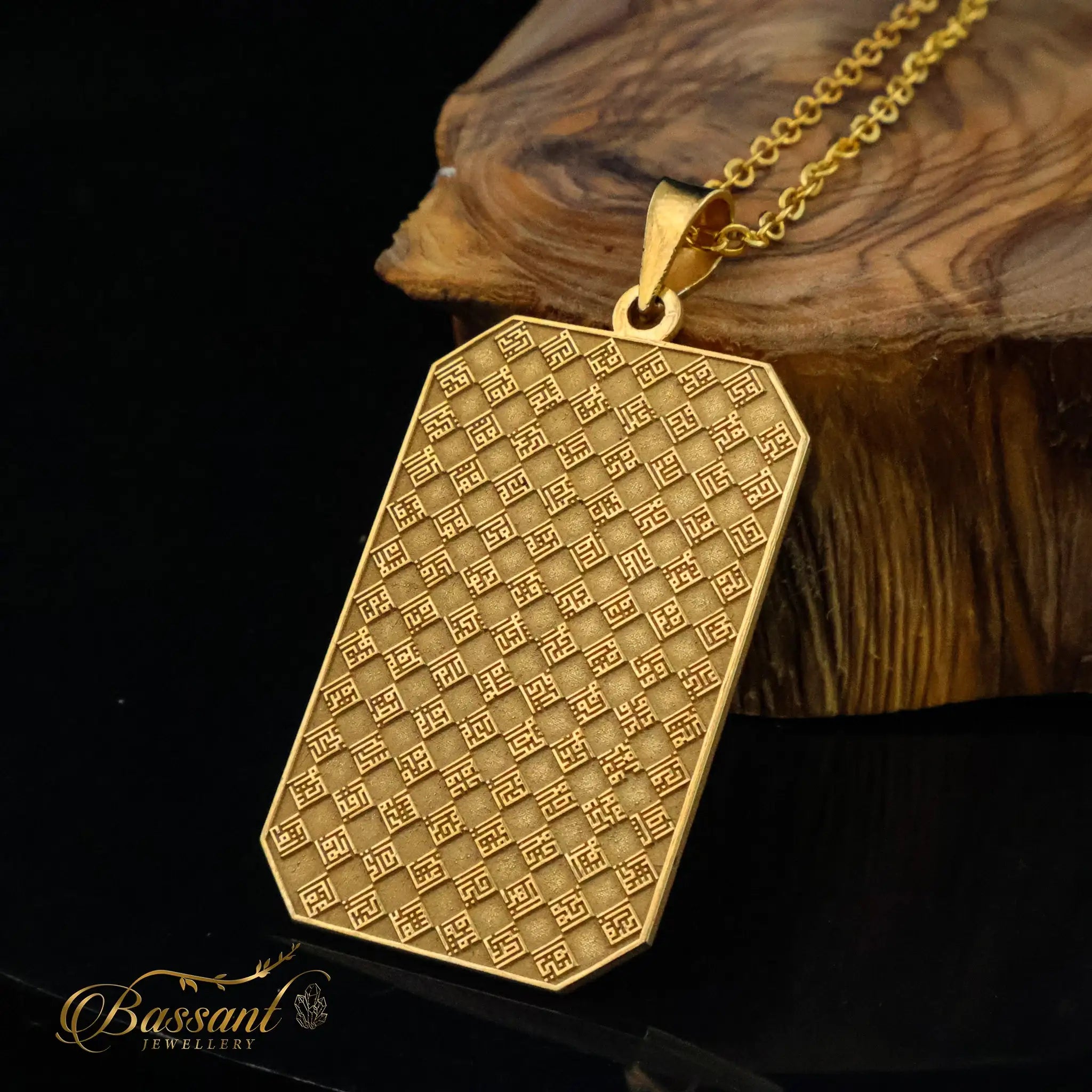 مصنوع ببراعة بطبقة مطلية بالذهب عيار 24 قيراط على الفضة الإسترلينية عيار 925، هذا القلادة هي تحفة حقيقية لعشاق الفن الإسلامي. التفاصيل المقطوعة بالليزر بدقة تعرض " جميع أسماء الله الحسنى " بخط كوفي بنمط متقن، مما يجعلها قطعة مذهلة لإضافتها إلى أي مجموعة.
