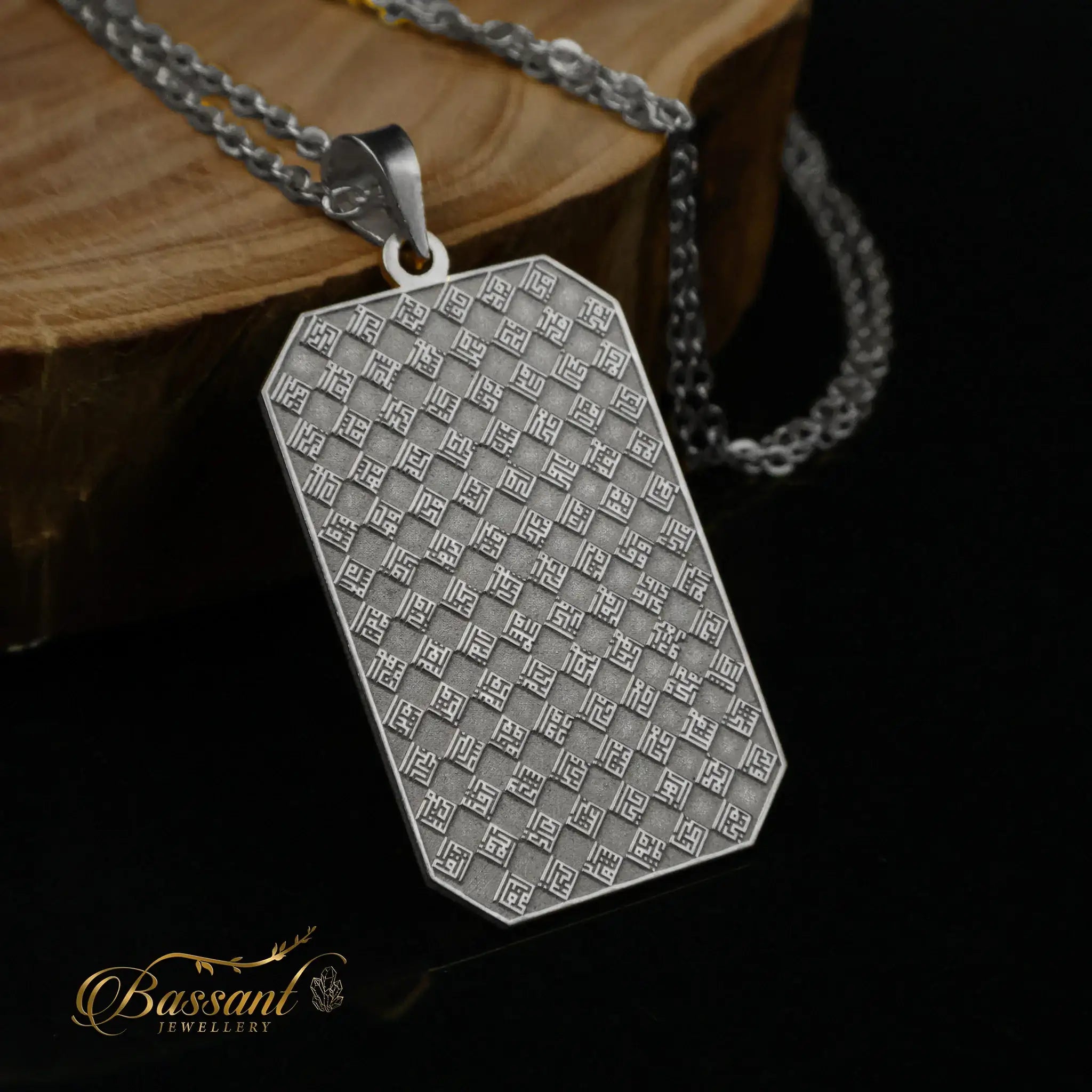 هذا القلادة المصنوعة بدقة تعرض فنًا استثنائيًا، حيث تحتوي على فضة استرليني 925k وطرق قطع بالليزر المتقدمة. النمط المعقد يعرض بشكل مثالي " جميع الأسماء المجيدة لله " بخط الكوفي، مما يظهرها كتحفة فنية.