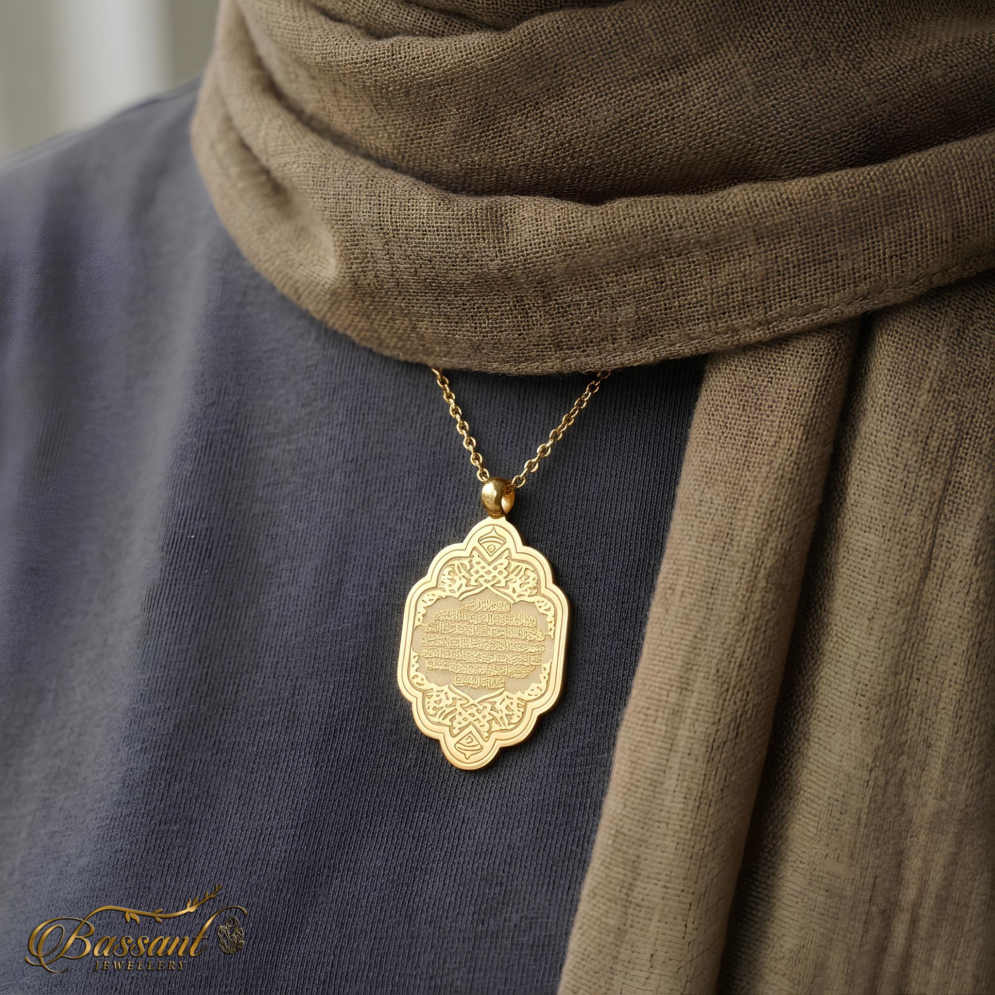 مصنوع بدقة بطبقة مطلية بالذهب عيار 24k على الفضة الإسترلينية 925k، هذا القلادة هي تحفة حقيقية لعشاق الفن الإسلامي. التفاصيل المقطوعة بالليزر بدقة تعرض جمال "آية الكرسي" في نمط متقن، مما يجعلها قطعة مذهلة لإضافتها إلى أي مجموعة.