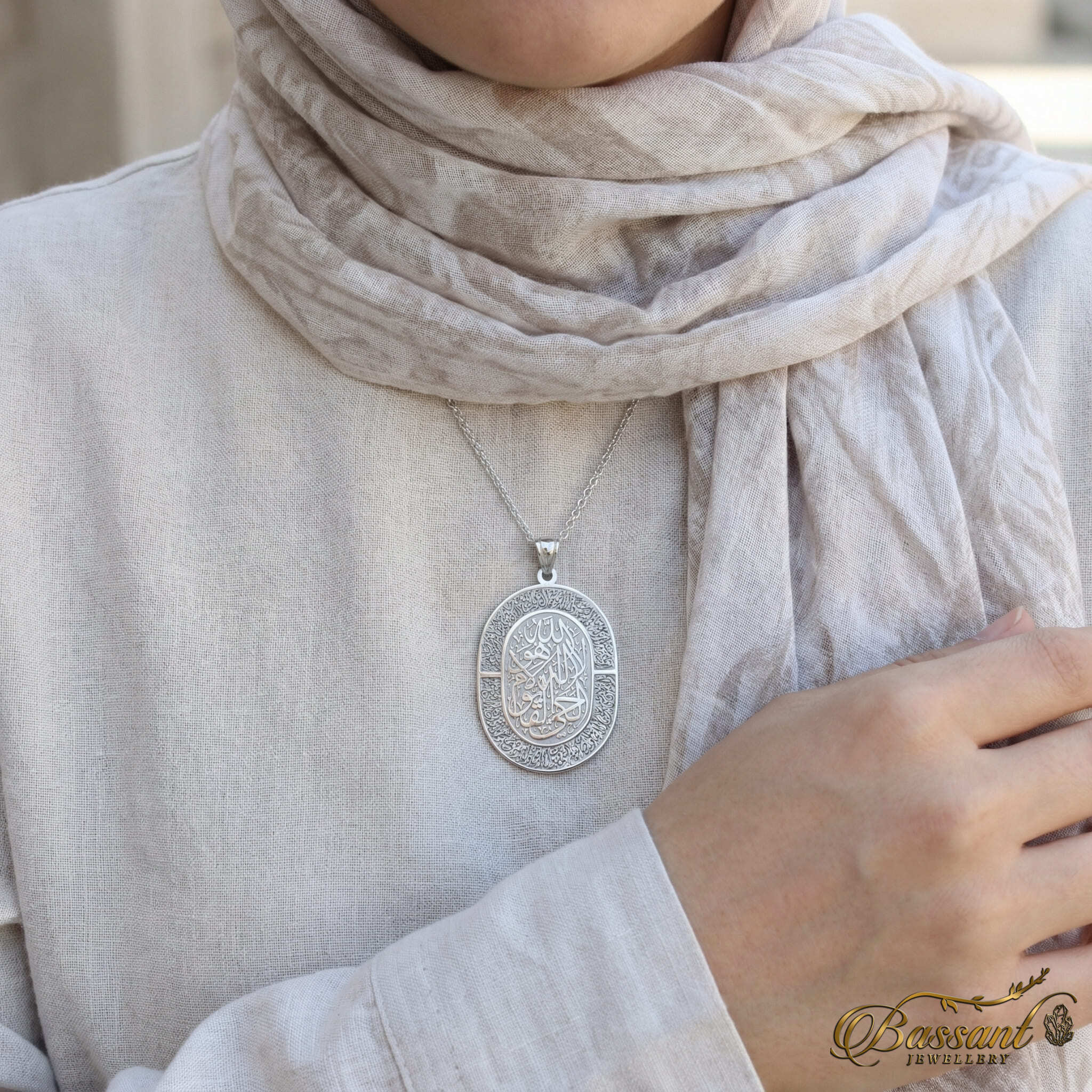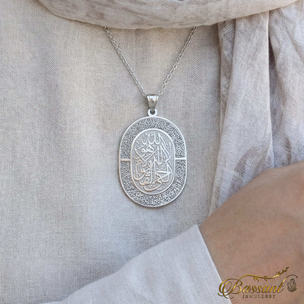 هذا القلادة المصنوعة بدقة تتميز بفن استثنائي، حيث تحتوي على فضة استرلينية 925k وطرق قطع بالليزر المتقنة. النمط المعقد يعرض بشكل مثالي "آية الكرسي"، مما يجعلها تحفة فنية.