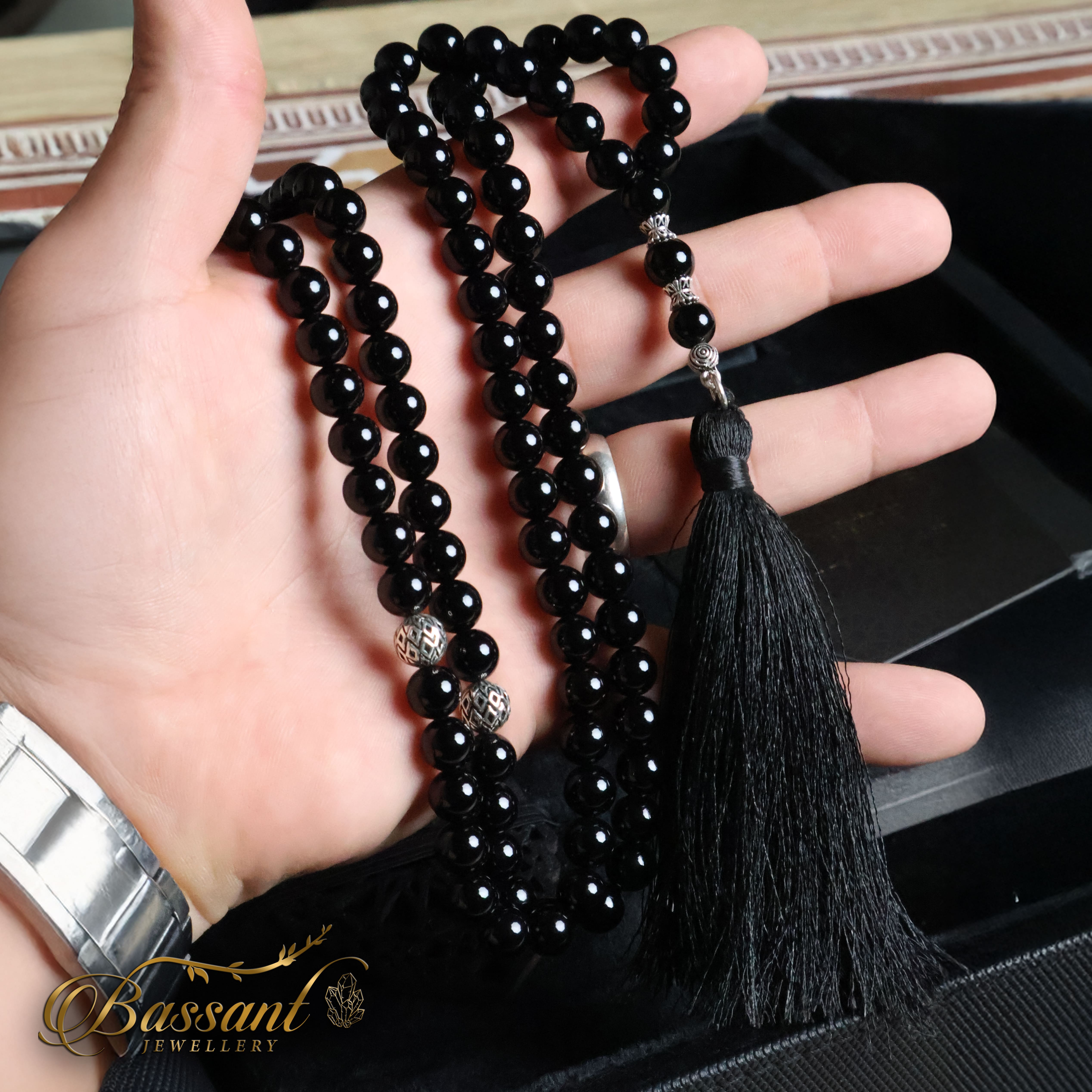 ◾ سبحة من حجر العقيق الأسود الطبيعي بأعلى جودة مع الفضة المستورة عيار ٩٢٥.