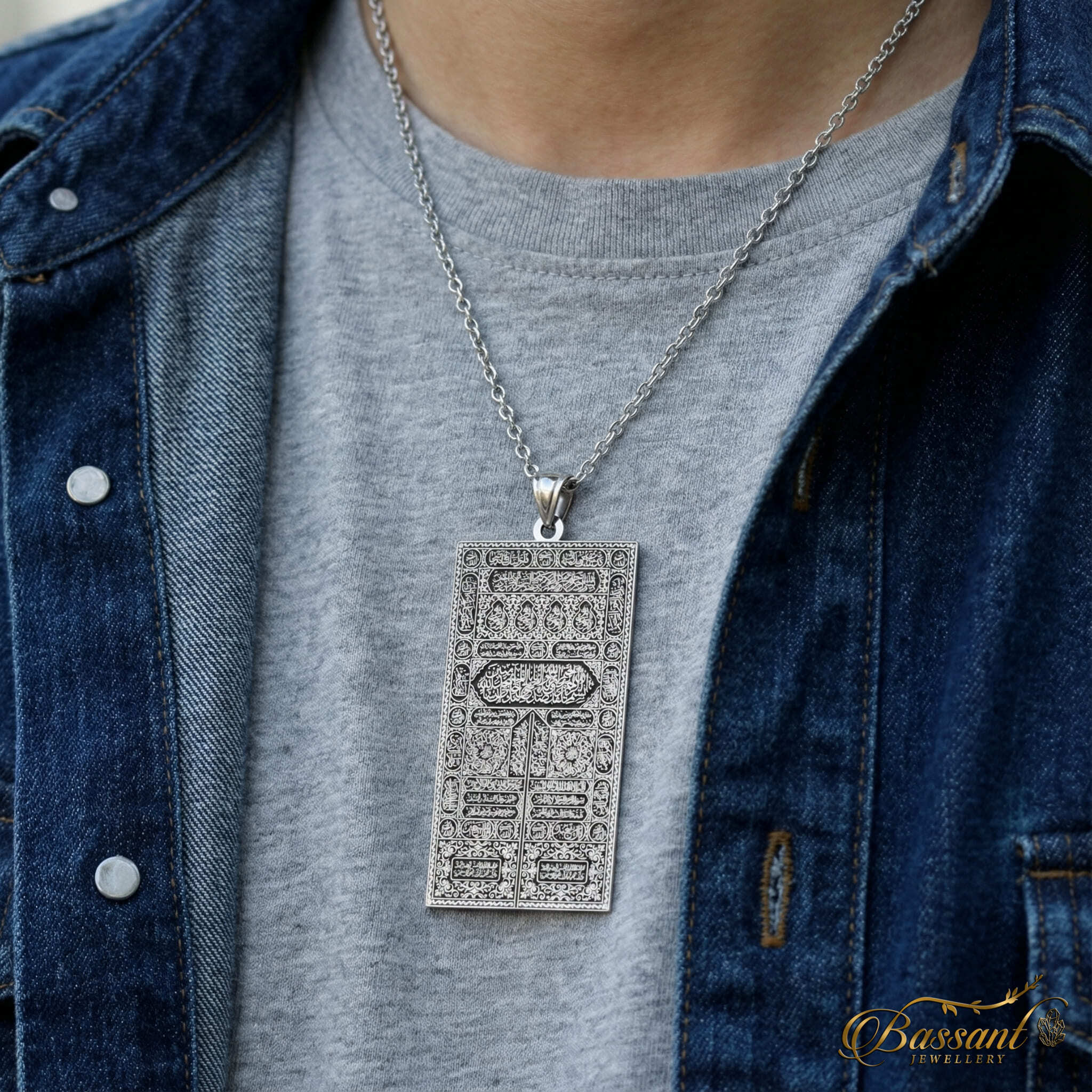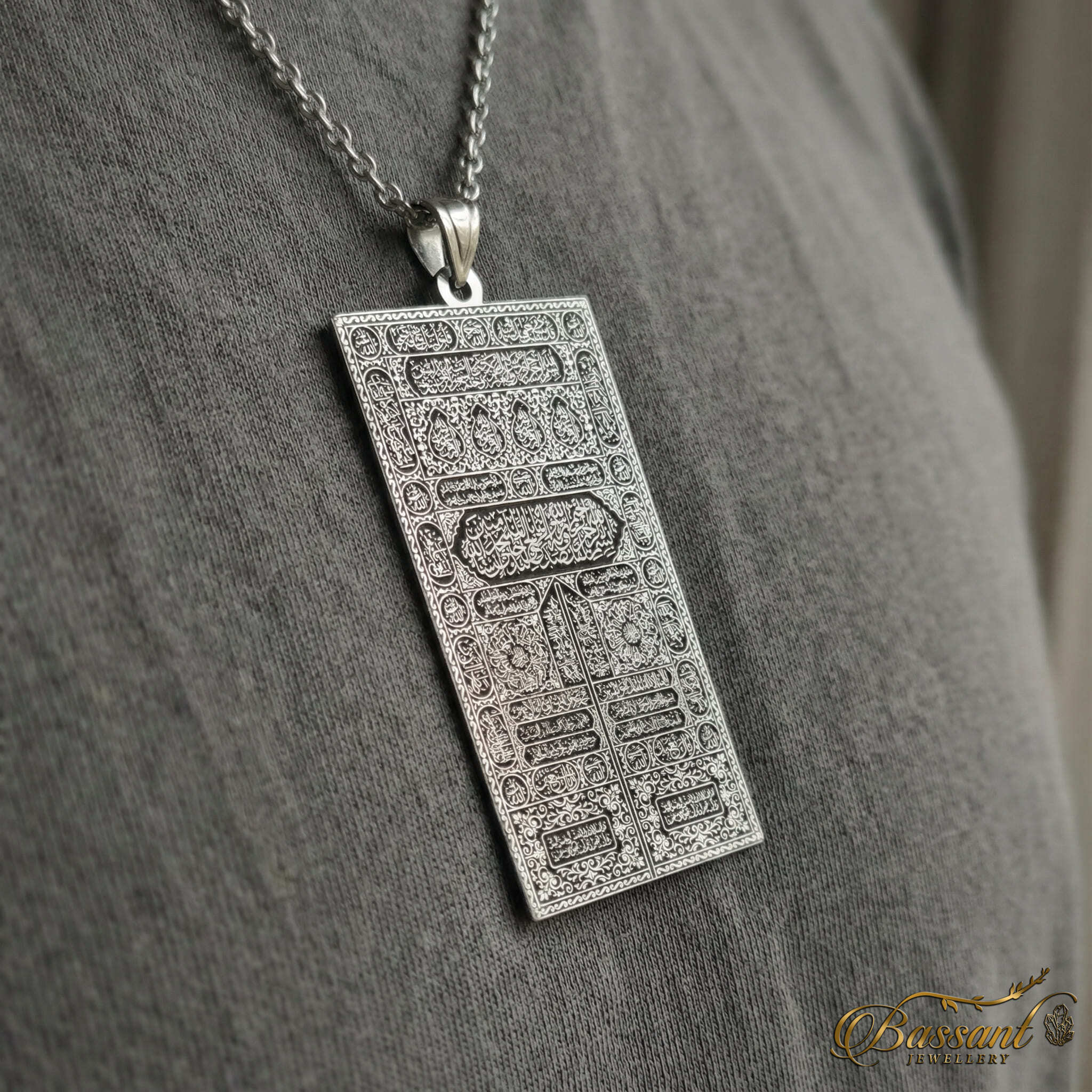 هذا القلادة المصنوعة بدقة تتميز بفن استثنائي، حيث تحتوي على فضة ستيرلينغ 925k وطرق قطع بالليزر متقنة. يعرض النمط المعقد بشكل مثالي "ستارة باب الكعبة المشرفة" بجميع تفاصيلها، مما يبرزها كقطعة فنية رائعة.