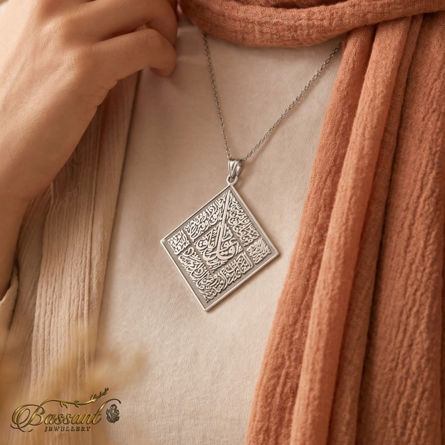 This finely-crafted pendant boasts exceptional artistry, featuring 925k Sterling Silver and expert laser-cutting methods. The elaborate pattern flawlessly displays "Surat Al-Falaq", Showcasing it as a masterpiece.