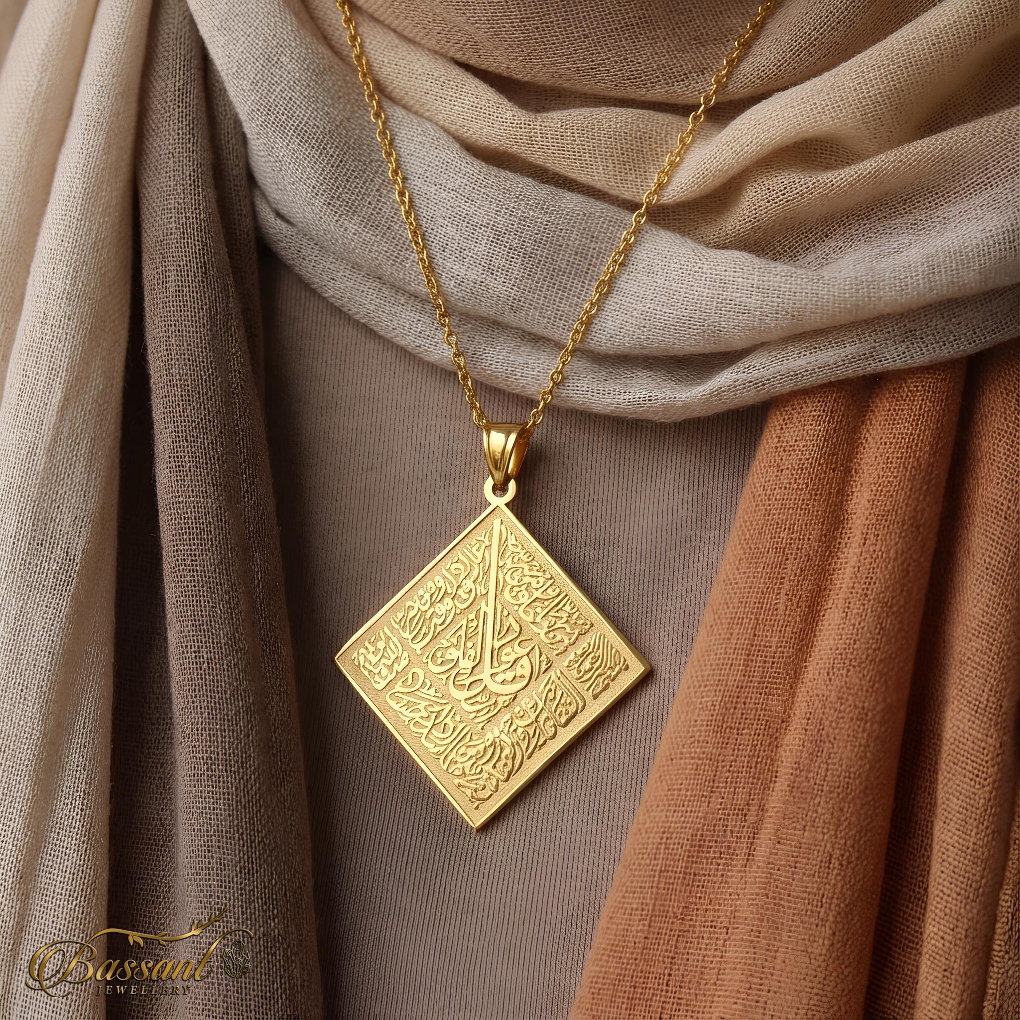Expertly crafted with a 24k Gold-plated layer on 925k Sterling Silver, This pendant is a true masterpiece for lovers of Islamic art. The flawless laser-cut detail showcases the beautiful "Surat Al-Falaq" in an elaborate pattern, making it a stunning piece to add to any collection.