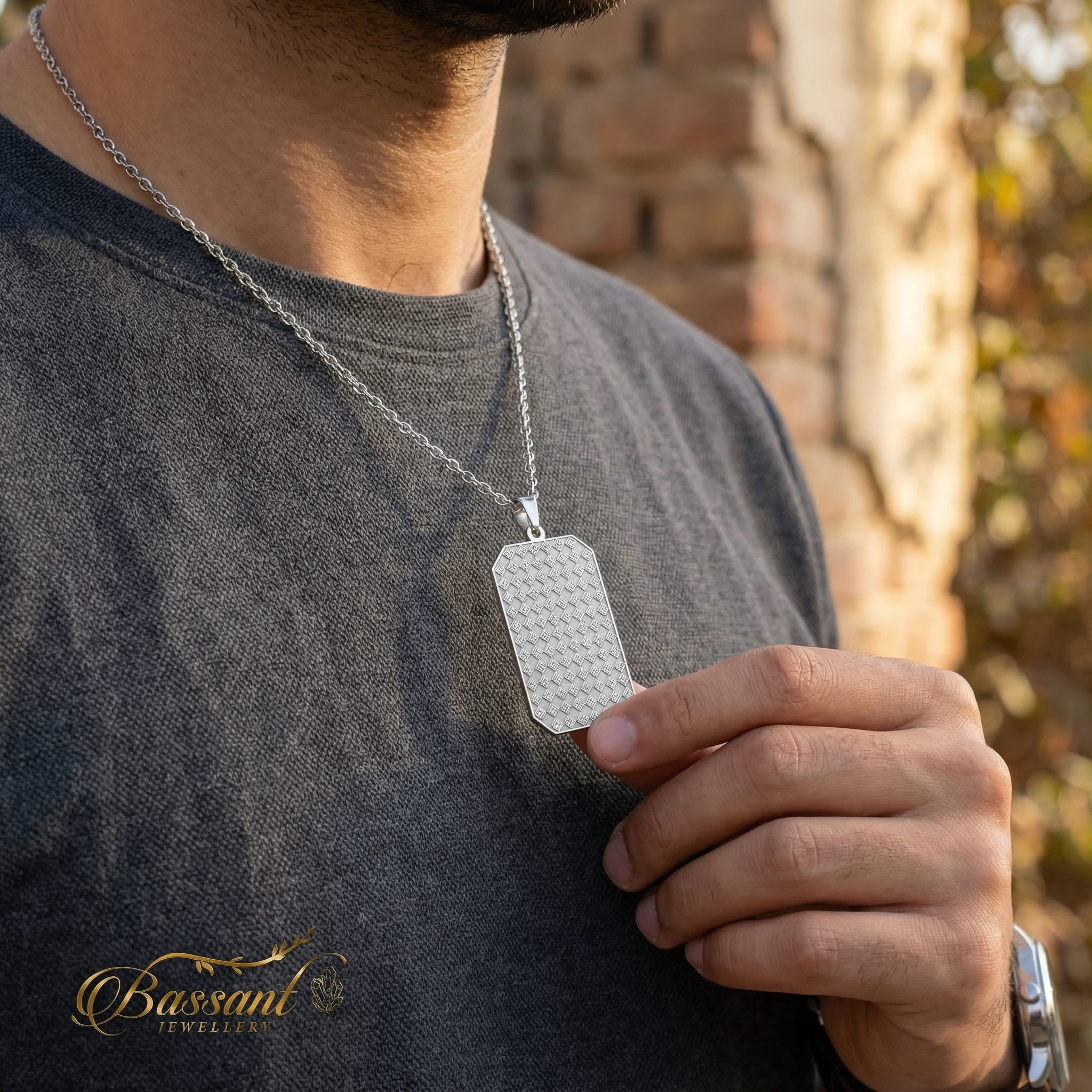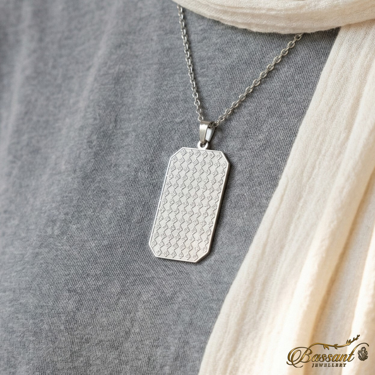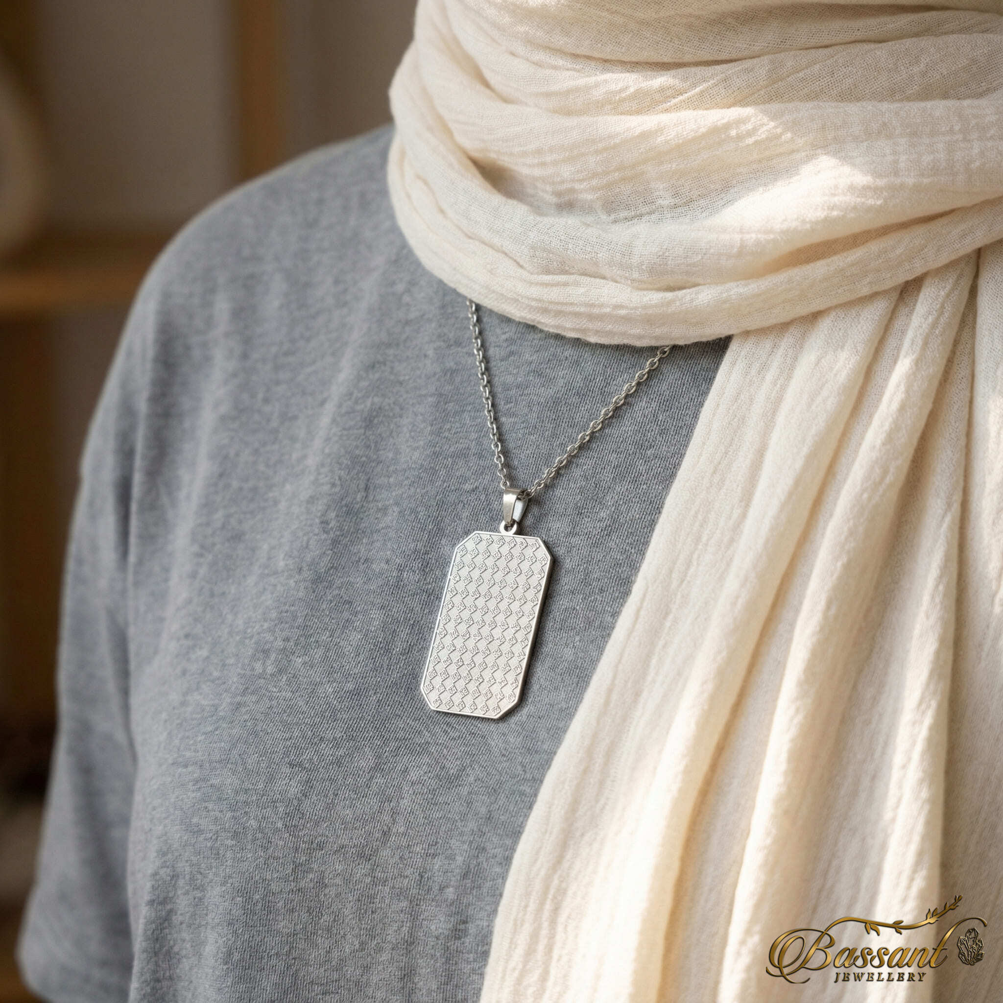 This finely-crafted pendant boasts exceptional artistry, featuring 925k Sterling Silver and expert laser-cutting methods. The elaborate pattern flawlessly displays " All glorious names of Allah " in Kufi font, Showcasing it as a masterpiece.