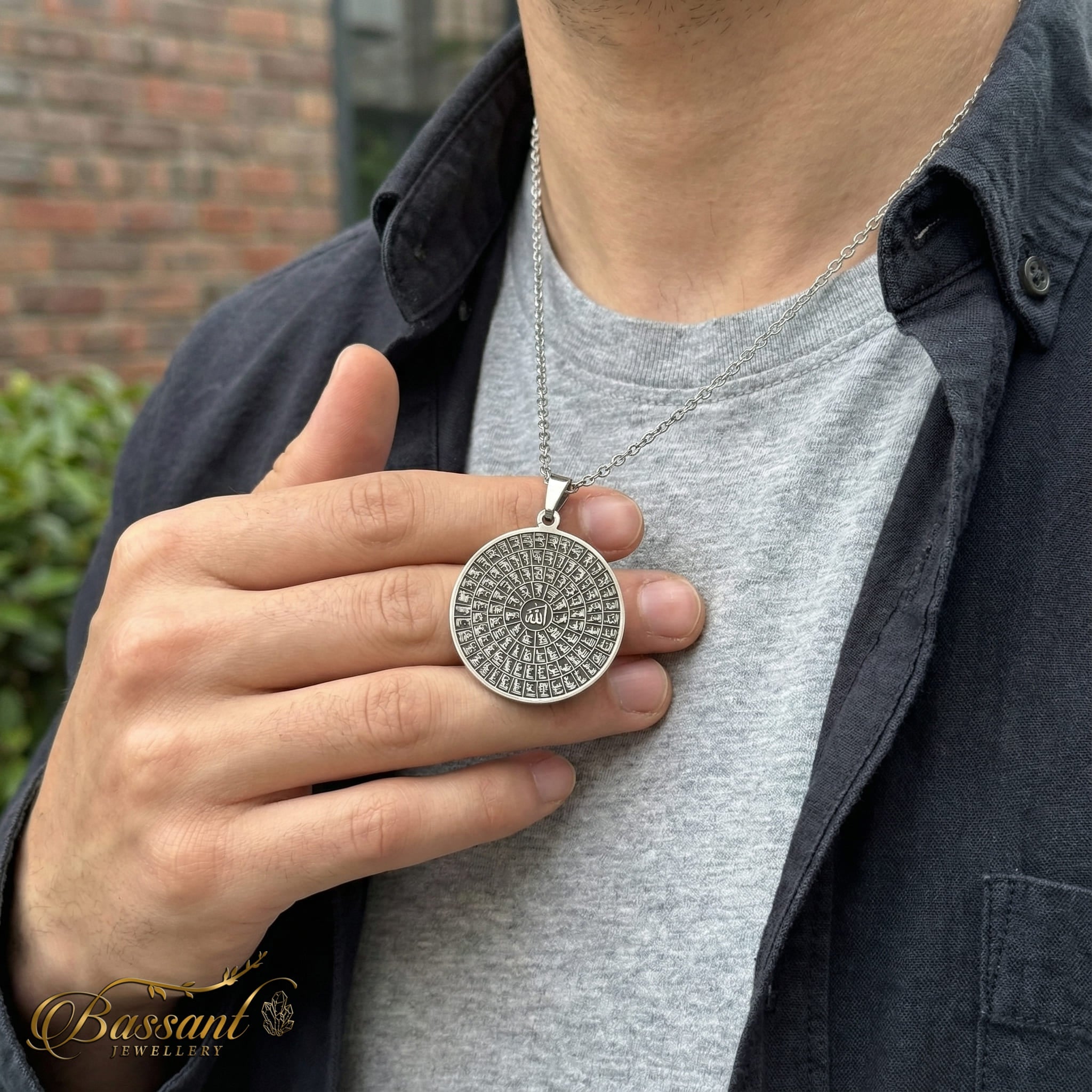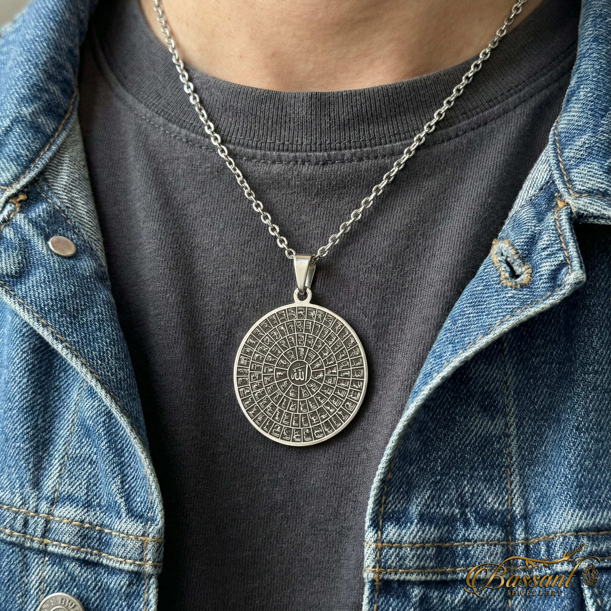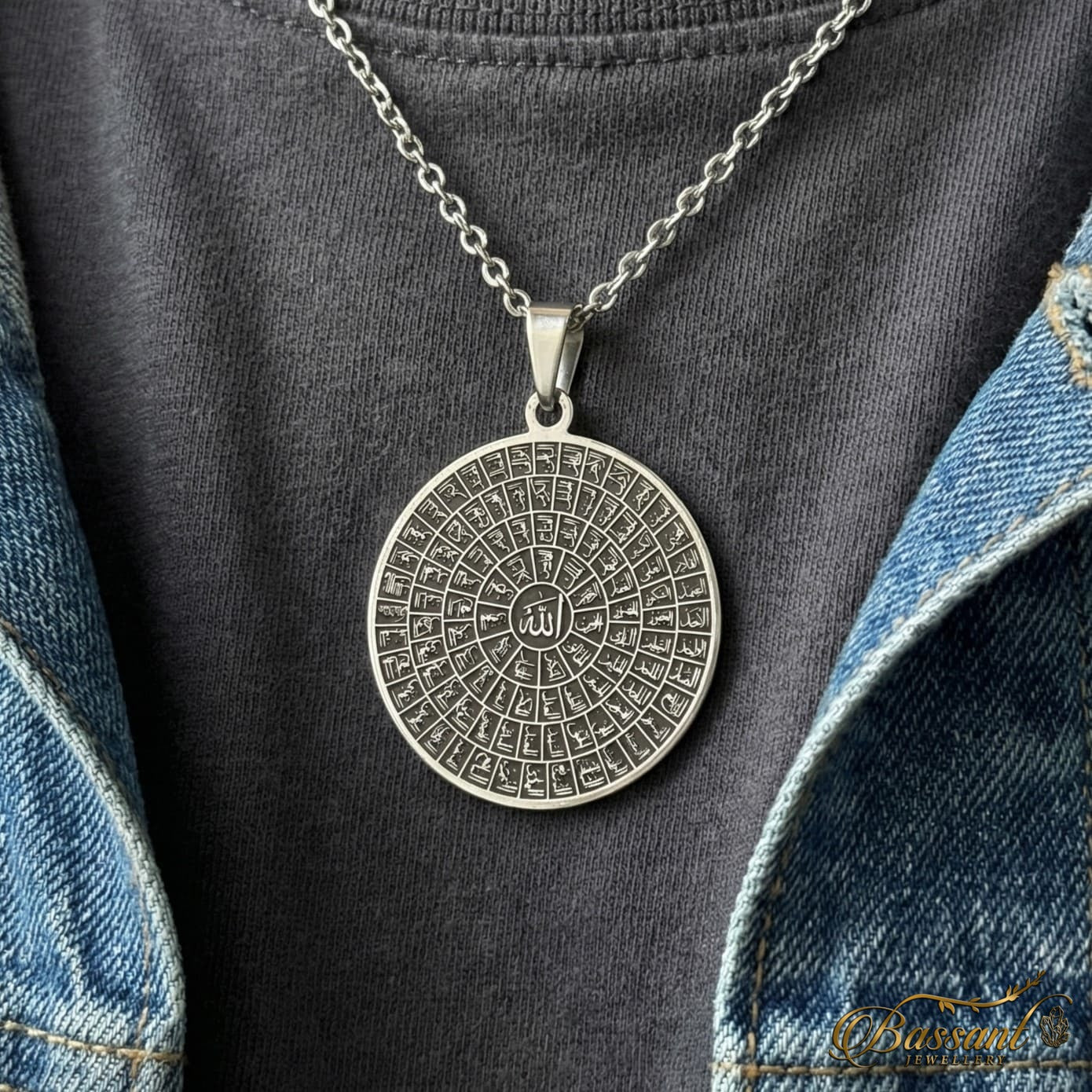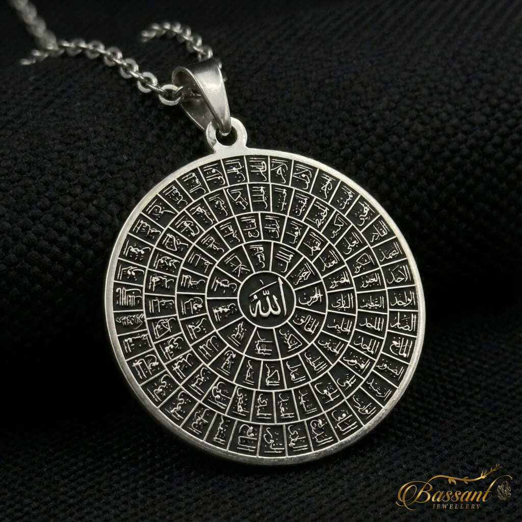 This finely-crafted pendant boasts exceptional artistry, featuring 925k Sterling Silver and expert laser-cutting methods. The elaborate pattern flawlessly displays " All glorious names of Allah ", Showcasing it as a masterpiece.