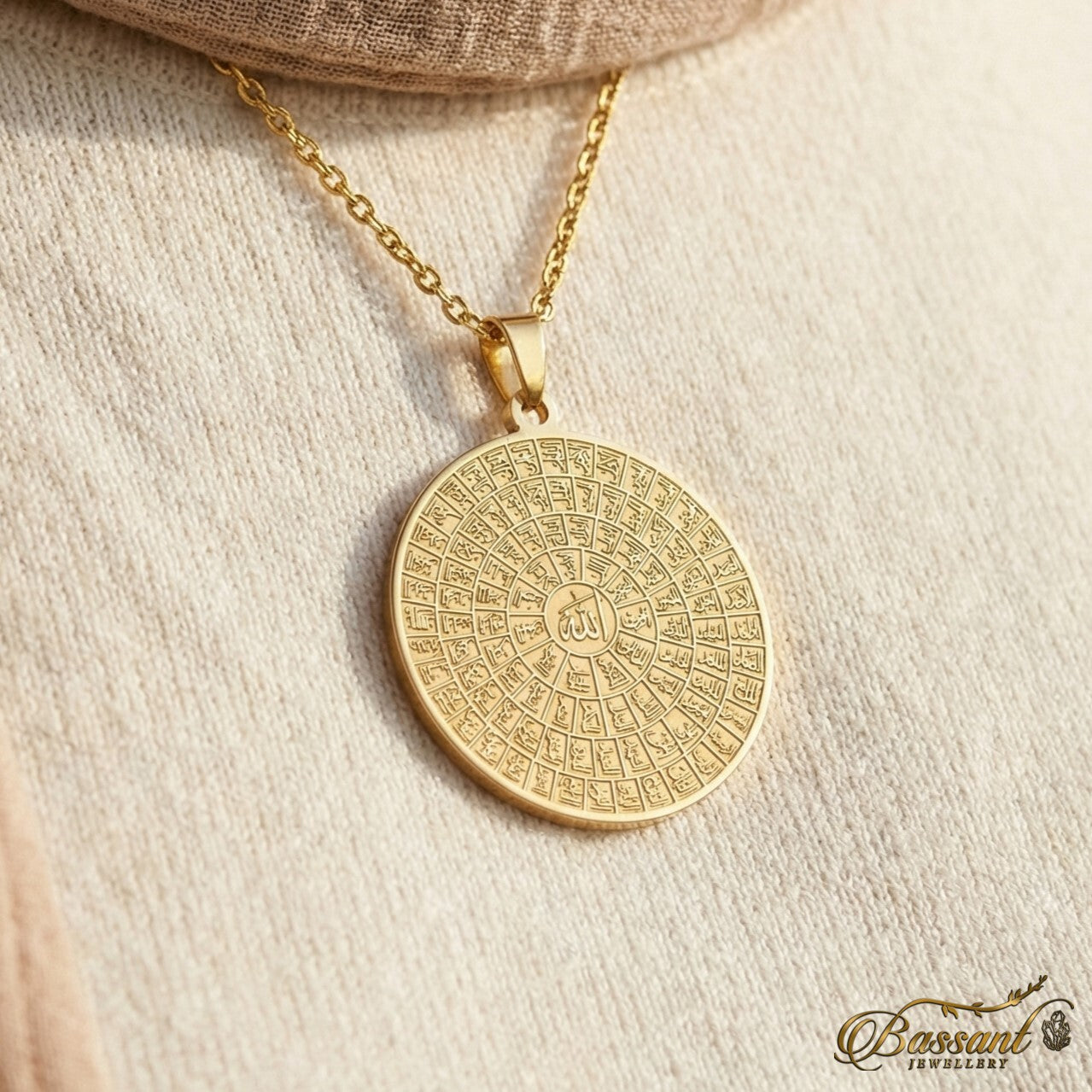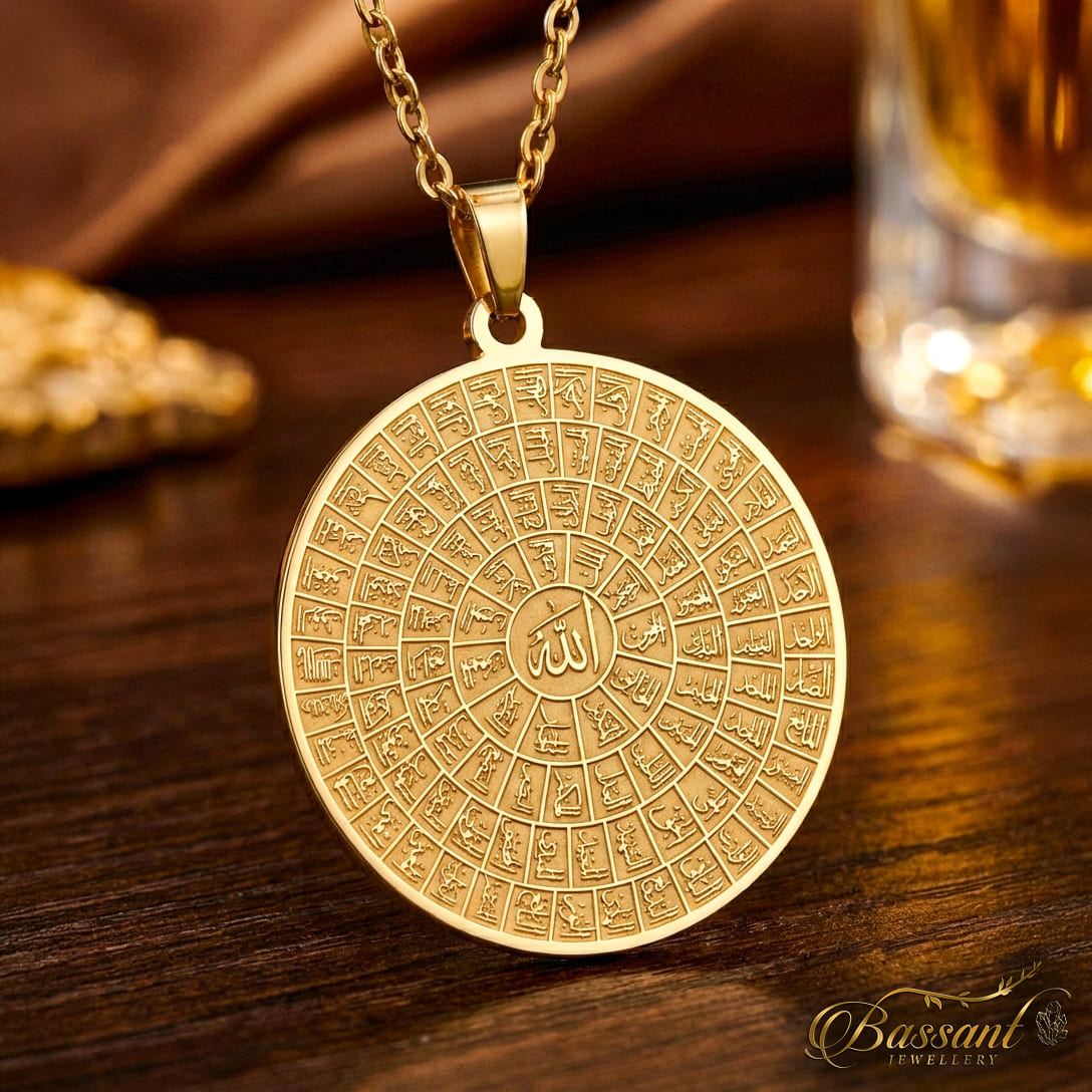 Expertly crafted with a 24k Gold-plated layer on 925k Sterling Silver, This pendant is a true masterpiece for lovers of Islamic art. The flawless laser-cut detail showcases the beautiful " All glorious names of Allah " in an elaborate pattern, making it a stunning piece to add to any collection.
