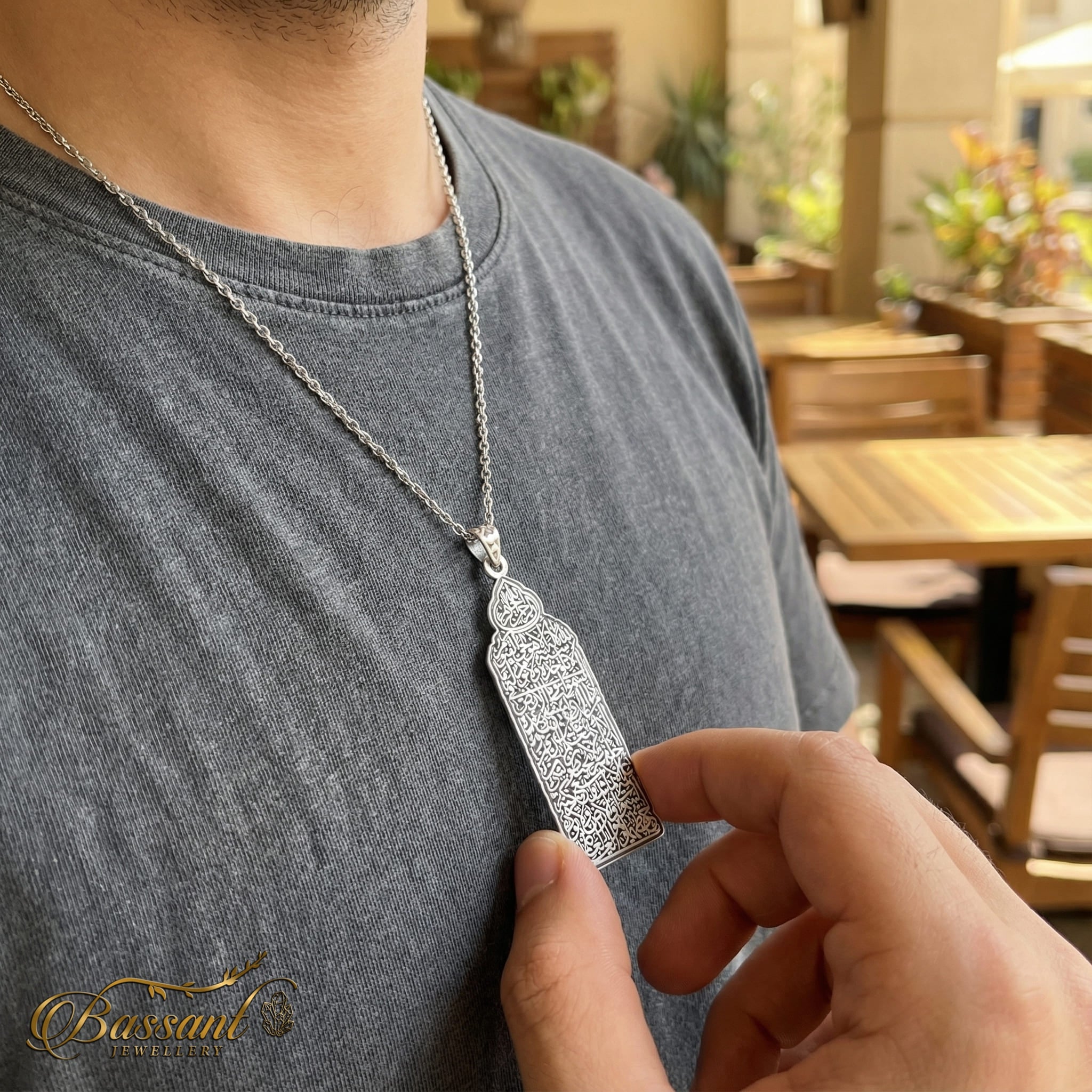 This finely-crafted pendant boasts exceptional artistry, featuring 925k Sterling Silver and expert laser-cutting methods. The elaborate pattern flawlessly displays " Al-Koursy Aya ", Showcasing it as a masterpiece.