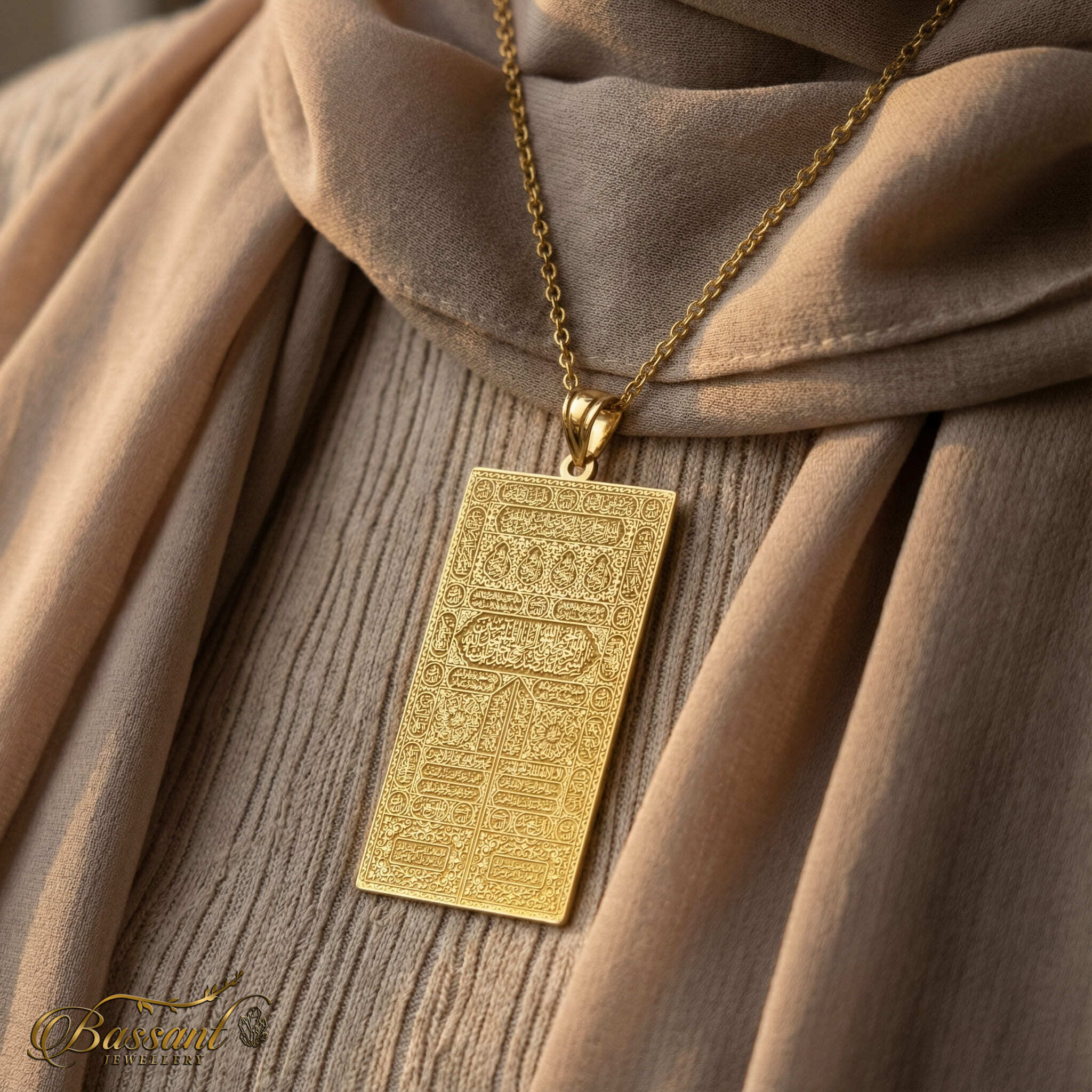 Expertly crafted with a 24k Gold-plated layer on 925k Sterling Silver, This pendant is a true masterpiece for lovers of Islamic art. The flawless laser-cut detail showcases the beautiful " Curtain of Holy Kaaba's door " with all its details in an elaborate pattern, making it a stunning piece to add to any collection.