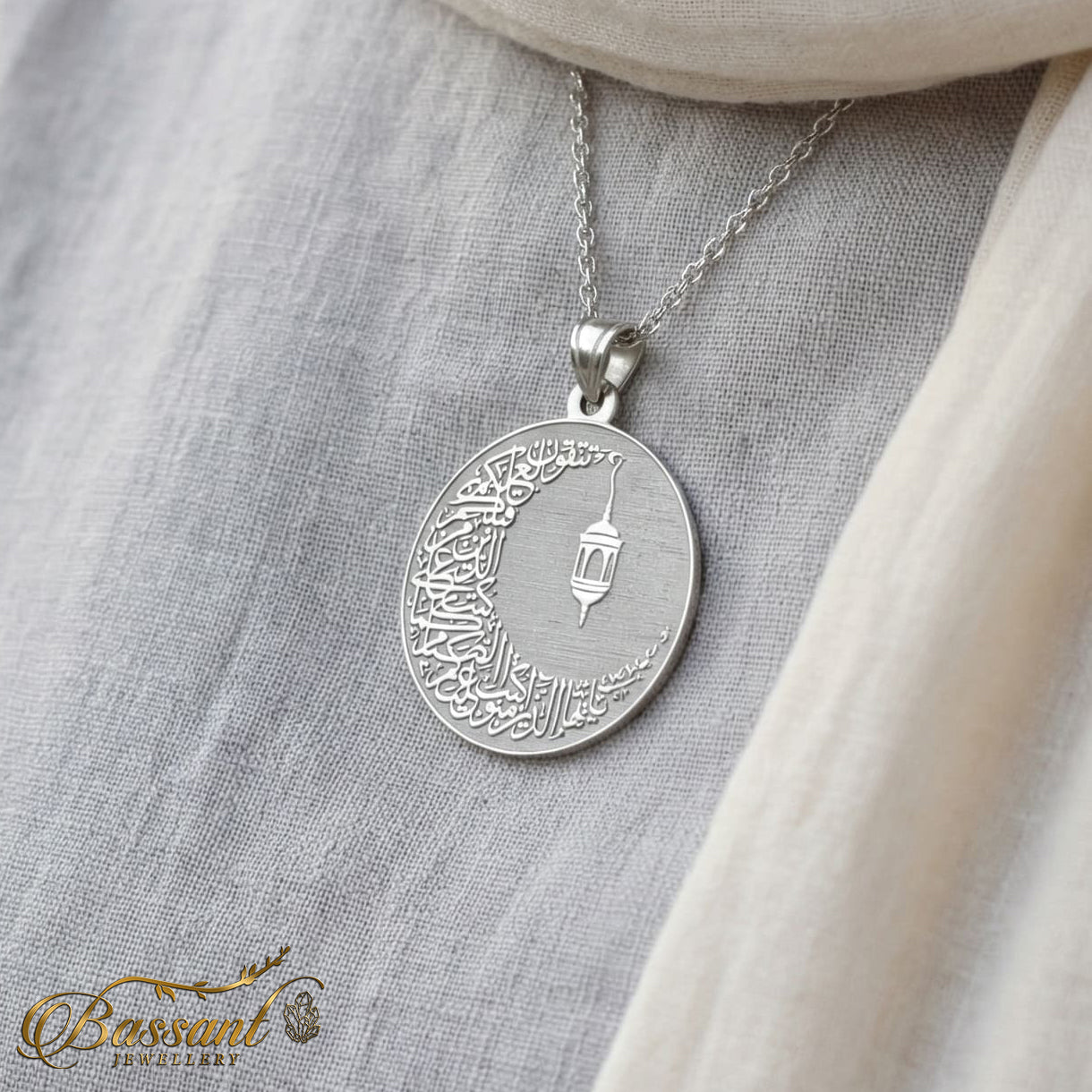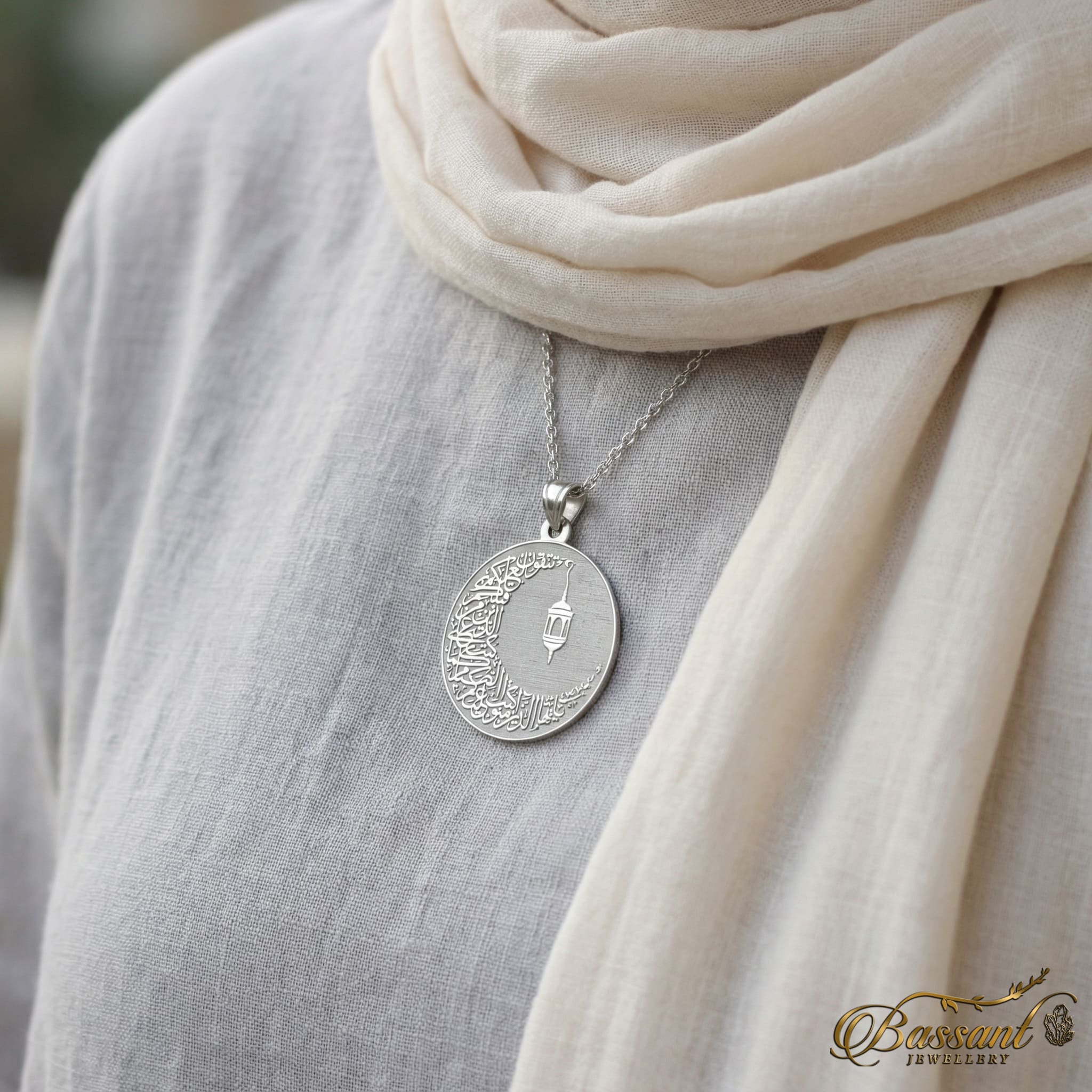 This finely-crafted pendant boasts exceptional artistry, featuring 925k Sterling Silver and expert laser-cutting methods. The elaborate pattern flawlessly displays ( Aya 183 ) of " Surat Al-Bakara ", Showcasing it as a masterpiece.